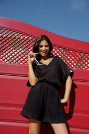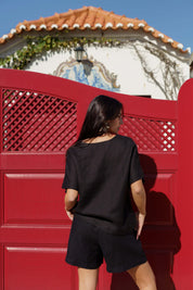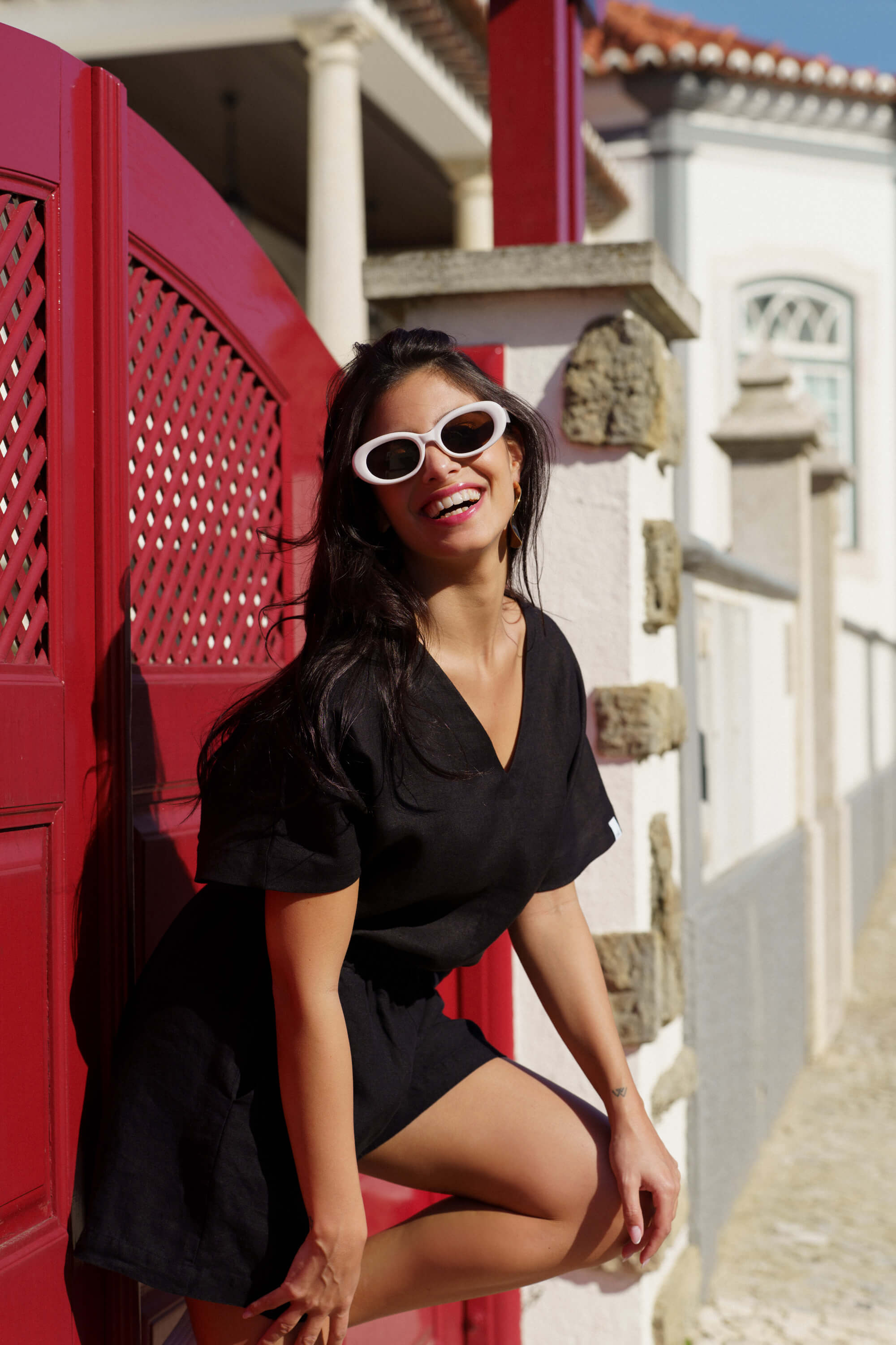Savanna Top is a boxy novelty top with dropped shoulders, a v-neckline and large, showy sleeves. This top combines a loose, Scandinavian design with feminine linen dressing. Savanna Top pairs well with Savanna Shorts, but also with any summer jeans you have in your wardrobe.