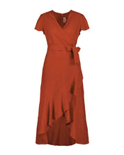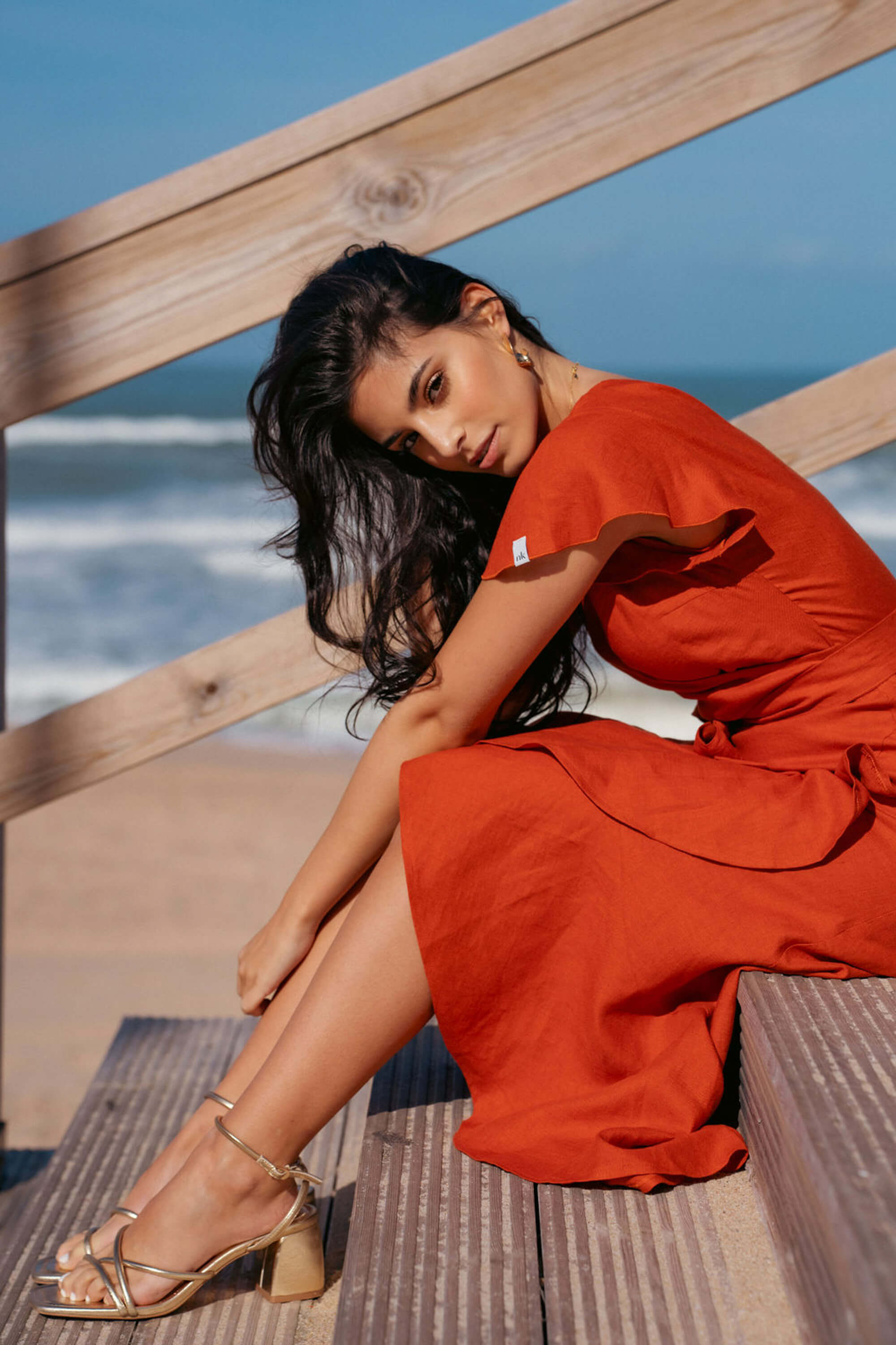 Made of 100% linen fabric, the dress is midi-sized, and the v-neck silhouette is repeated in the cut of the hem. The light linen fabric feels breathable on the skin. The fabric has the Ökötex standard.