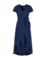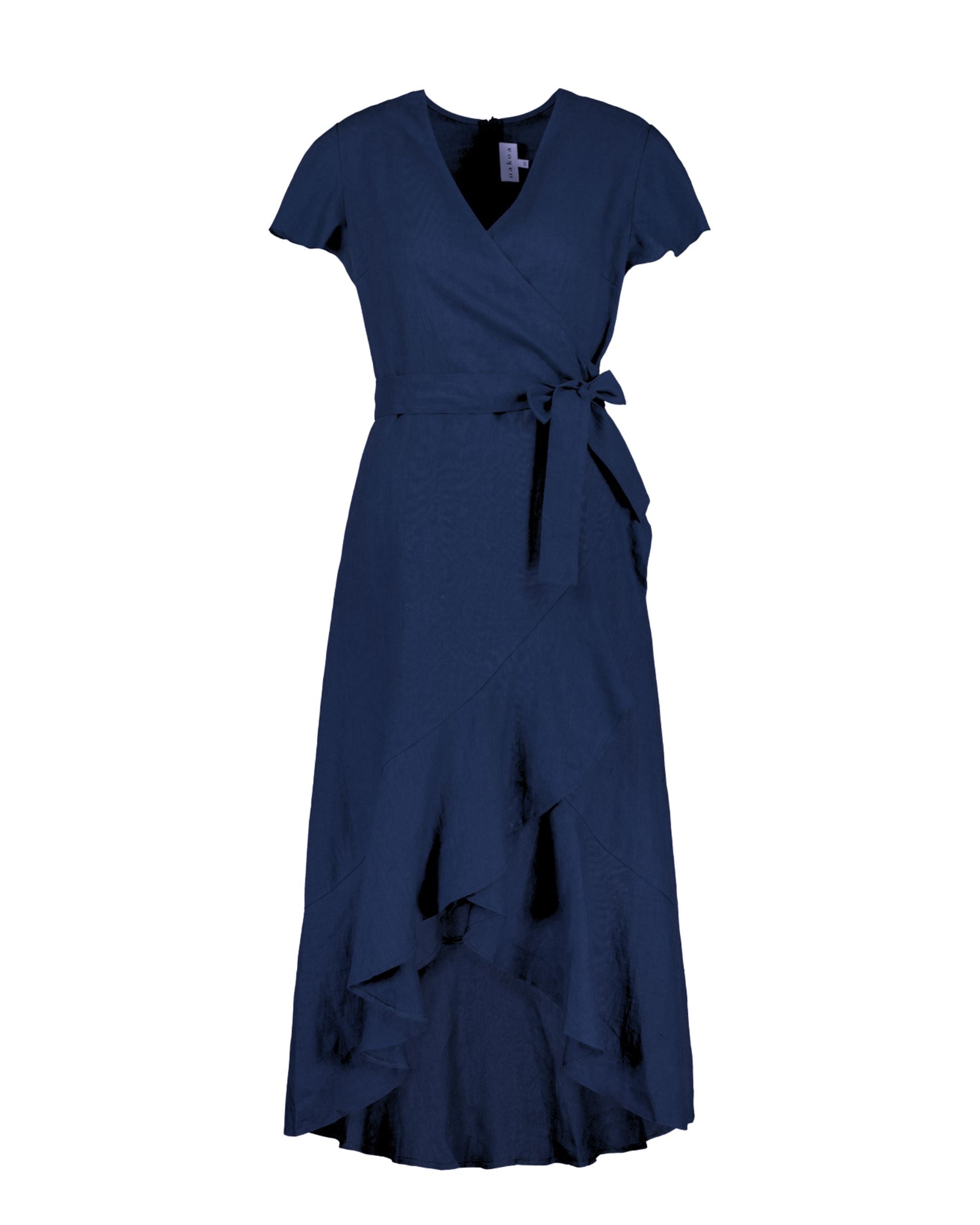 Made of 100% linen fabric, the dress is midi-sized, and the v-neck silhouette is repeated in the cut of the hem. The light linen fabric feels breathable on the skin. The fabric has the Ökötex standard.