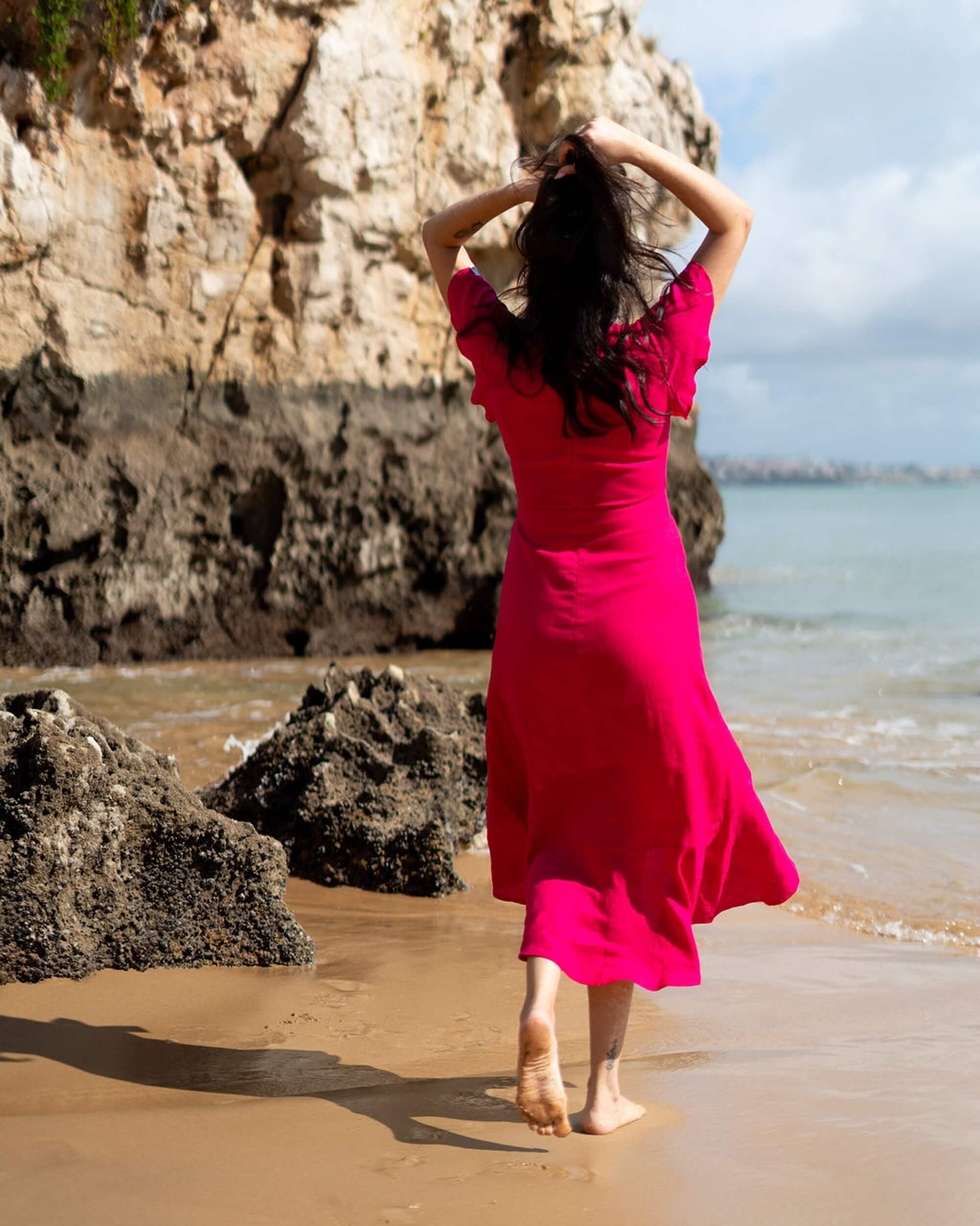Nakoa's new Annika Dress is a feminine eye-catcher. The dress has a flattering waistline, and a belt that can be tied in different ways ensure a fit for every body. The flattering cut creates a beautiful silhouette, emphasizing just the right points. The wavy pleats repeated on the hem and sleeves fall beautifully on the light fabric and take the mind to adventures in the cobblestone alleys of Southern Europe or to happy summer days with your toes against the freshly cut lawn. The lining of the dress adds a level of carefreeness.