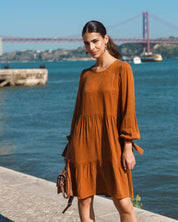 The Hailey Dress is a knee-length layered dress with beautiful bow sleeves as a detail. There is a slit and a small button at the back of the neck, which make it easier to put on. Cupro-viscose fabric works well in the dress, falling beautifully, creating a sophisticated impression.