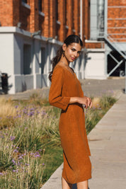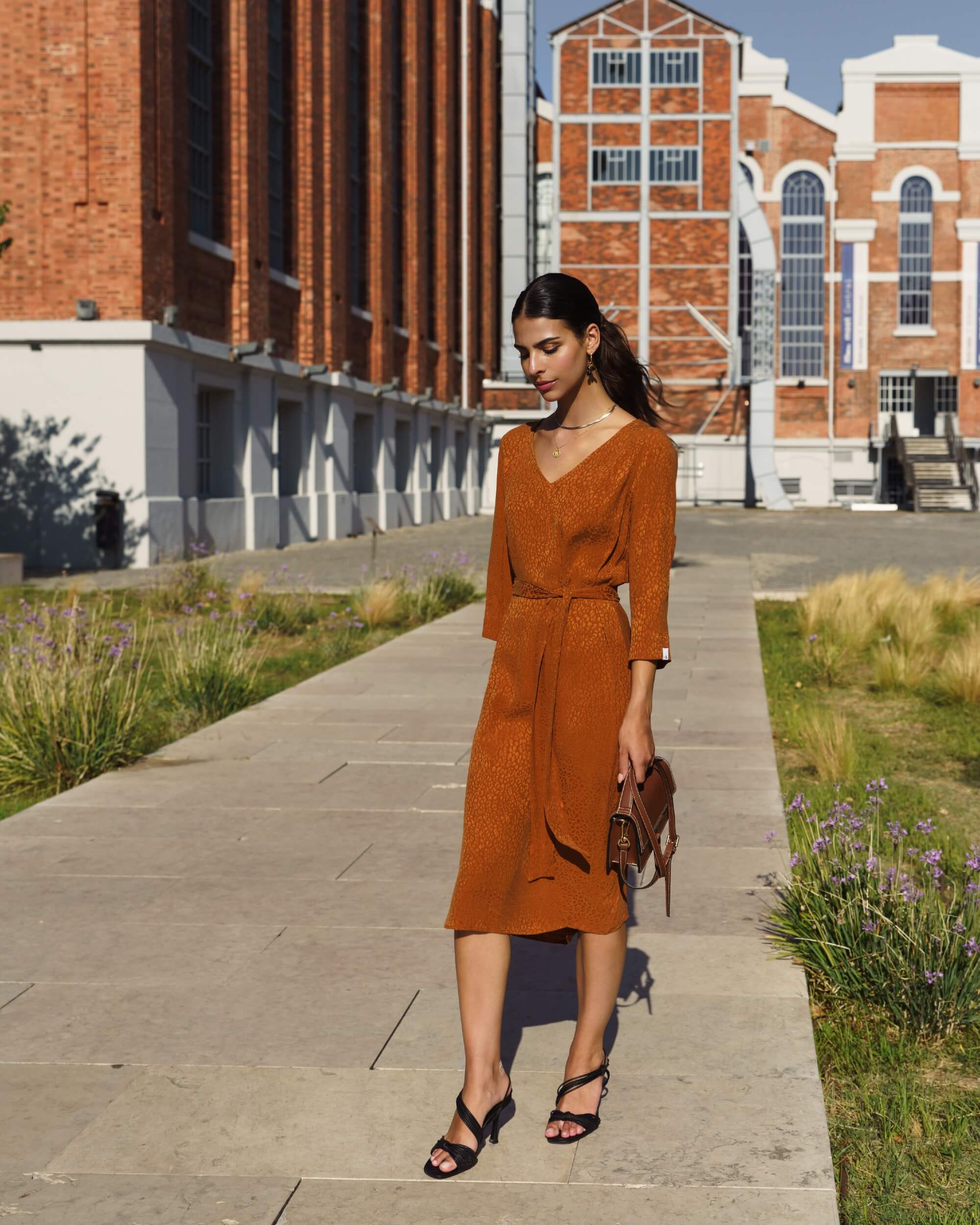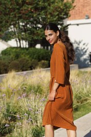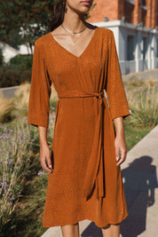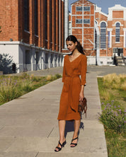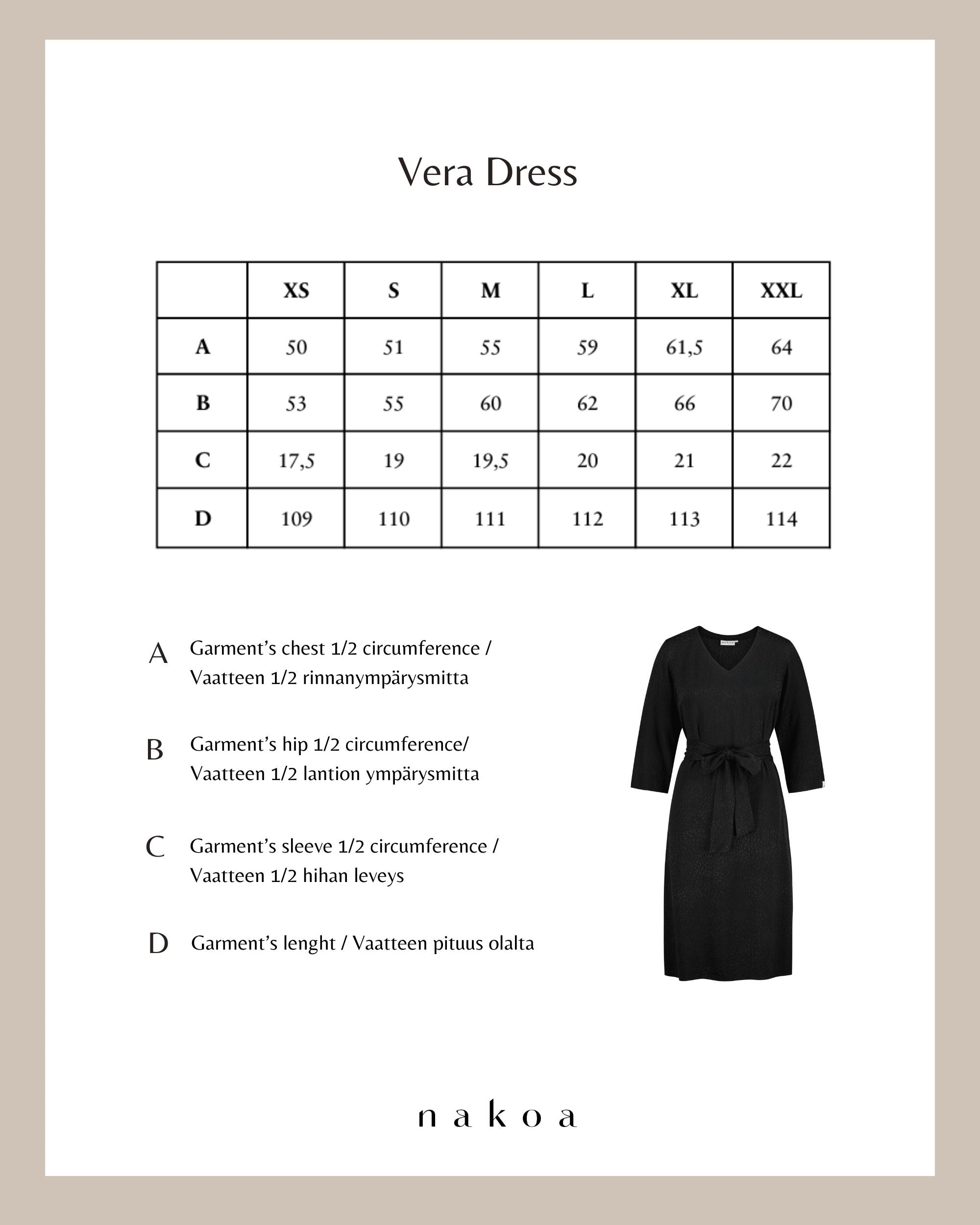 Nakoa's Vera Dress is a simply elegant and carefree dress. This flattering black dress is a wardrobe staple, making it an easy choice for everyday wear. Celebrating effortless femininity, the Vera Dress is designed to drape beautifully on every body type. The detachable belt can be tied at the waist for a defined silhouette, but the dress also looks elegant without it. The dress features a beautiful and flattering silhouette, with a wide belt that can be tied at the front or back, or removed entirely if preferred. It has a V-neckline, a knee-length hem, and ¾-length sleeves.