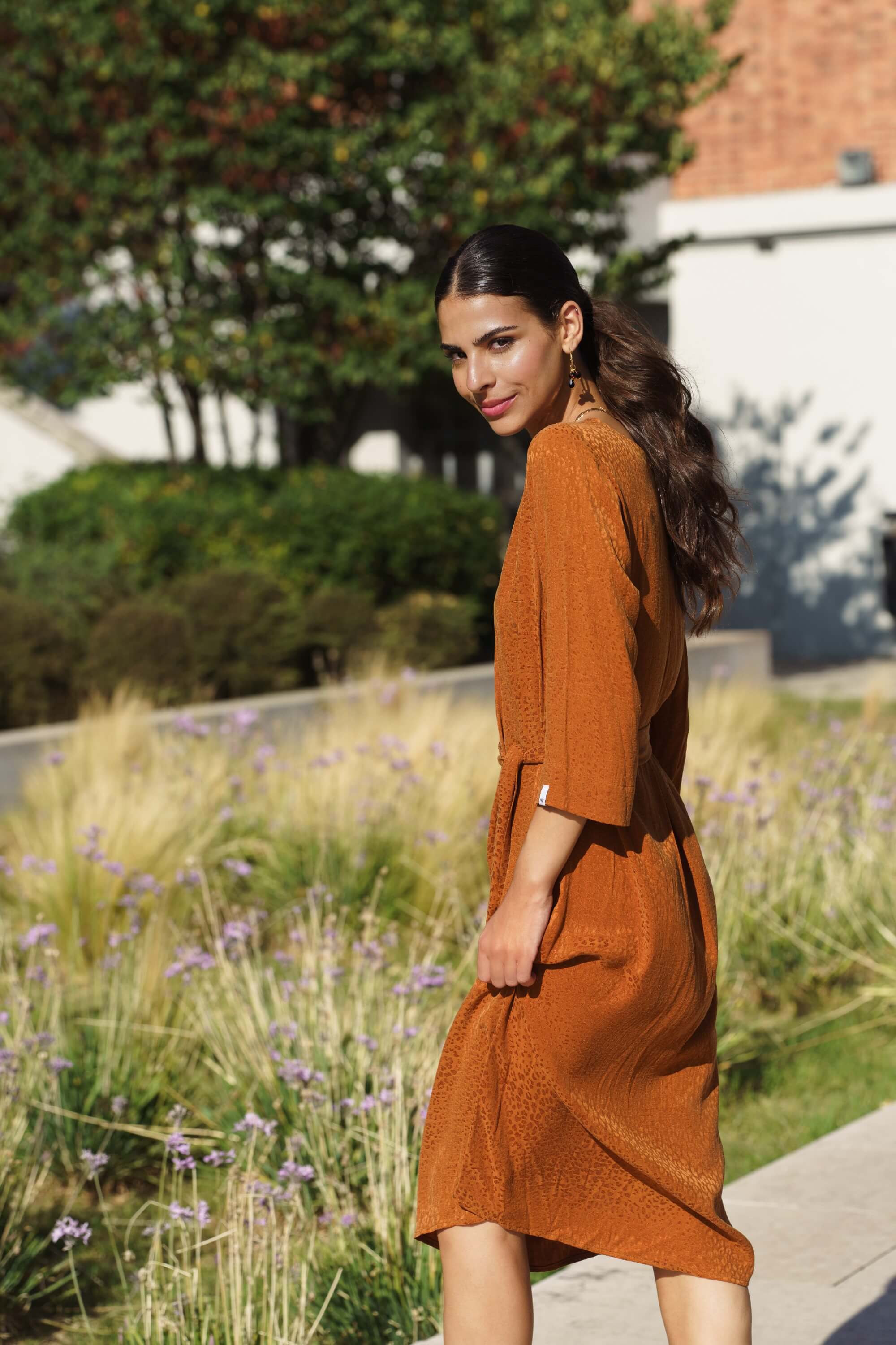 The Golden Leo fabric boasts a beautiful textured surface, with an elegant leopard pattern that adds a touch of sophistication to the garment. The cupro used by Nakoa is a premium fiber material made from cellulose, known for its luxurious appearance and feel. This material combines softness, durability, and breathability in a unique way. Cupro is also celebrated for its excellent drape, providing garments with an elegant, wrinkle-free look.