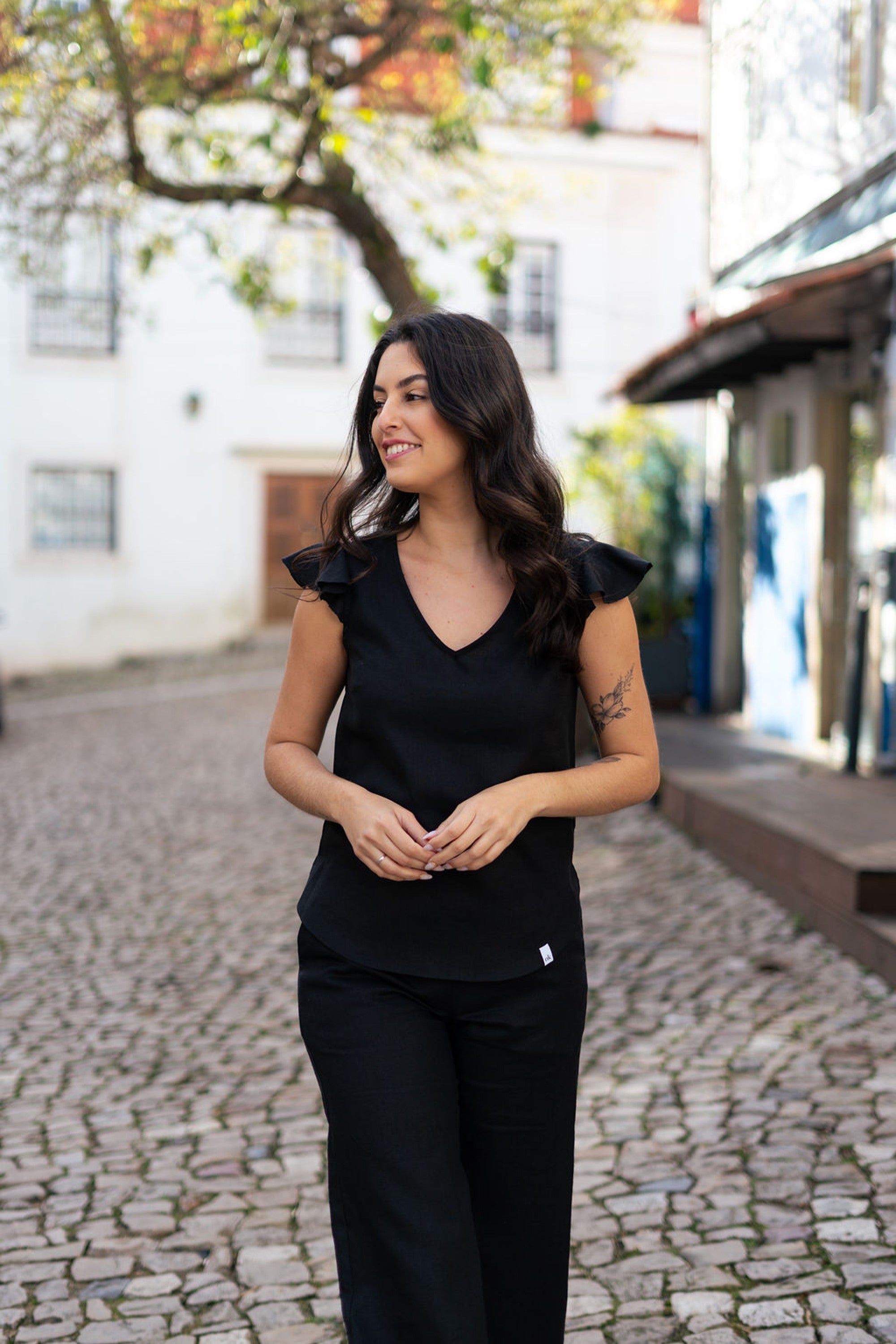 Sofia Top is an elegant top with attractive ruffled sleeves that create a beautiful silhouette for the shirt. V-neckline is a classic and spring choice! Form pleats and cuts bring poise to the top.