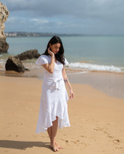 Nakoa's new Annika Dress is a feminine eye-catcher. The dress has a flattering waistline, and a belt that can be tied in different ways ensure a fit for every body. The flattering cut creates a beautiful silhouette, emphasizing just the right points. The wavy pleats repeated on the hem and sleeves fall beautifully on the light fabric and take the mind to adventures in the cobblestone alleys of Southern Europe or to happy summer days with your toes against the freshly cut lawn. The lining of the dress adds a level of carefreeness.