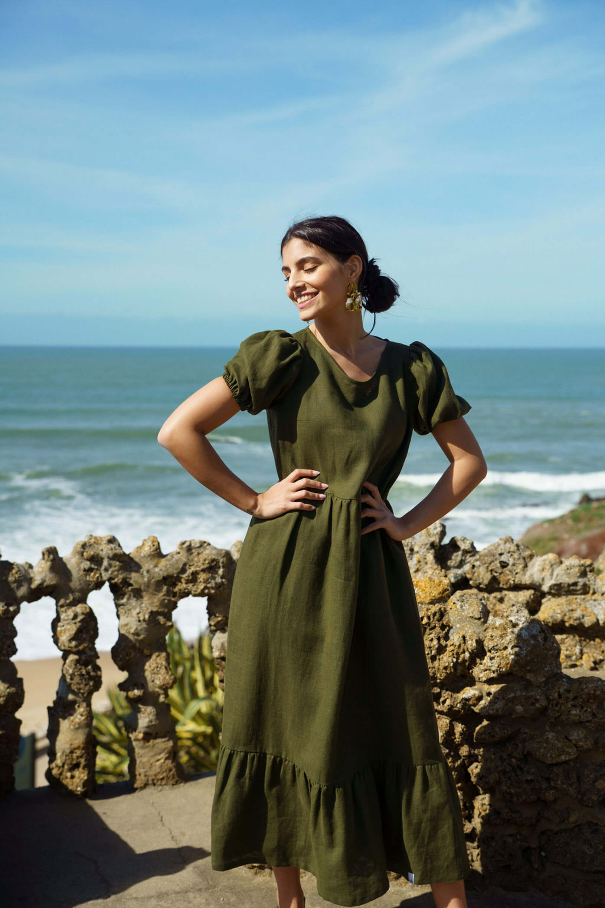 This summer's trendy new linen dress is the relaxed Astrid Dress! The gorgeously flowing 100% linen layered dress is a must-have summer product that is easy to style. Astrid Dress is a loose but flattering summer dress with puffy sleeves. This long linen maxi dress is a carefree and feminine choice for warm days.