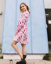 The Hailey Dress is a knee-length or slightly above-the-knee layered dress, the detail of which is the beautiful bow sleeves. There is a slit at the back of the neck and a small button, which make it easier to put on. The Fillsens fabric works well in the dress, falling beautifully, creating a sophisticated impression.