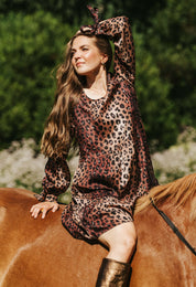 The Hailey Dress is a knee-length or slightly above-the-knee layered dress, the detail of which is the beautiful bow sleeves. There is a slit at the back of the neck and a small button, which make it easier to put on. The Fillsens fabric works well in the dress, falling beautifully, creating a sophisticated impression.