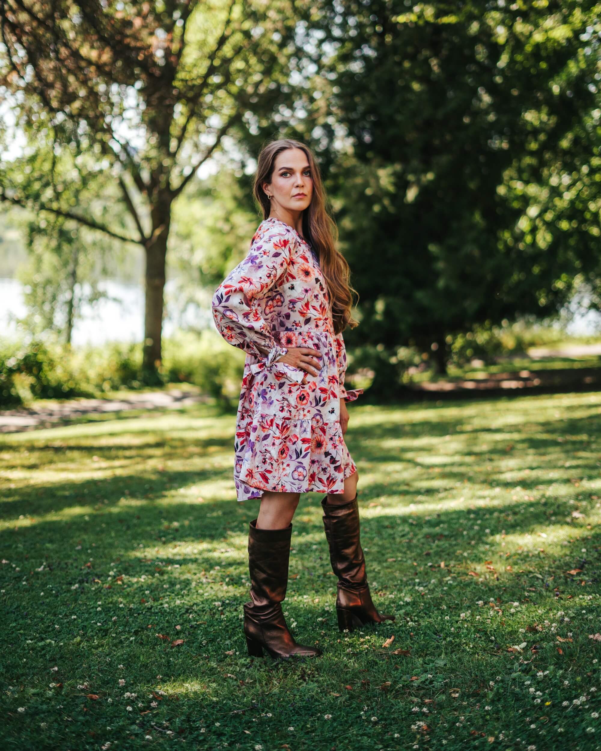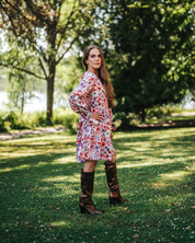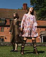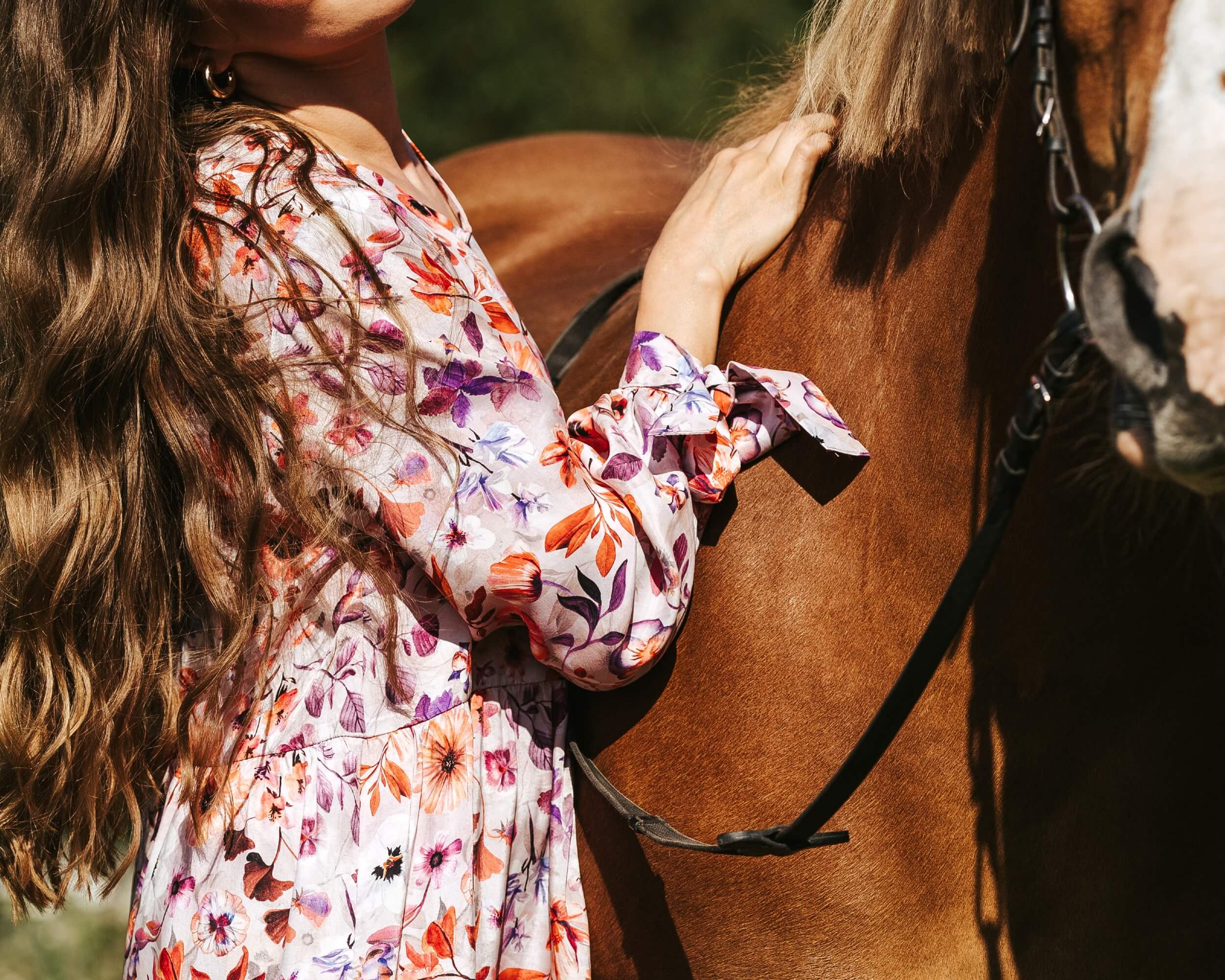 The Hailey Dress is a knee-length or slightly above-the-knee layered dress, the detail of which is the beautiful bow sleeves. There is a slit at the back of the neck and a small button, which make it easier to put on. The Fillsens fabric works well in the dress, falling beautifully, creating a sophisticated impression.