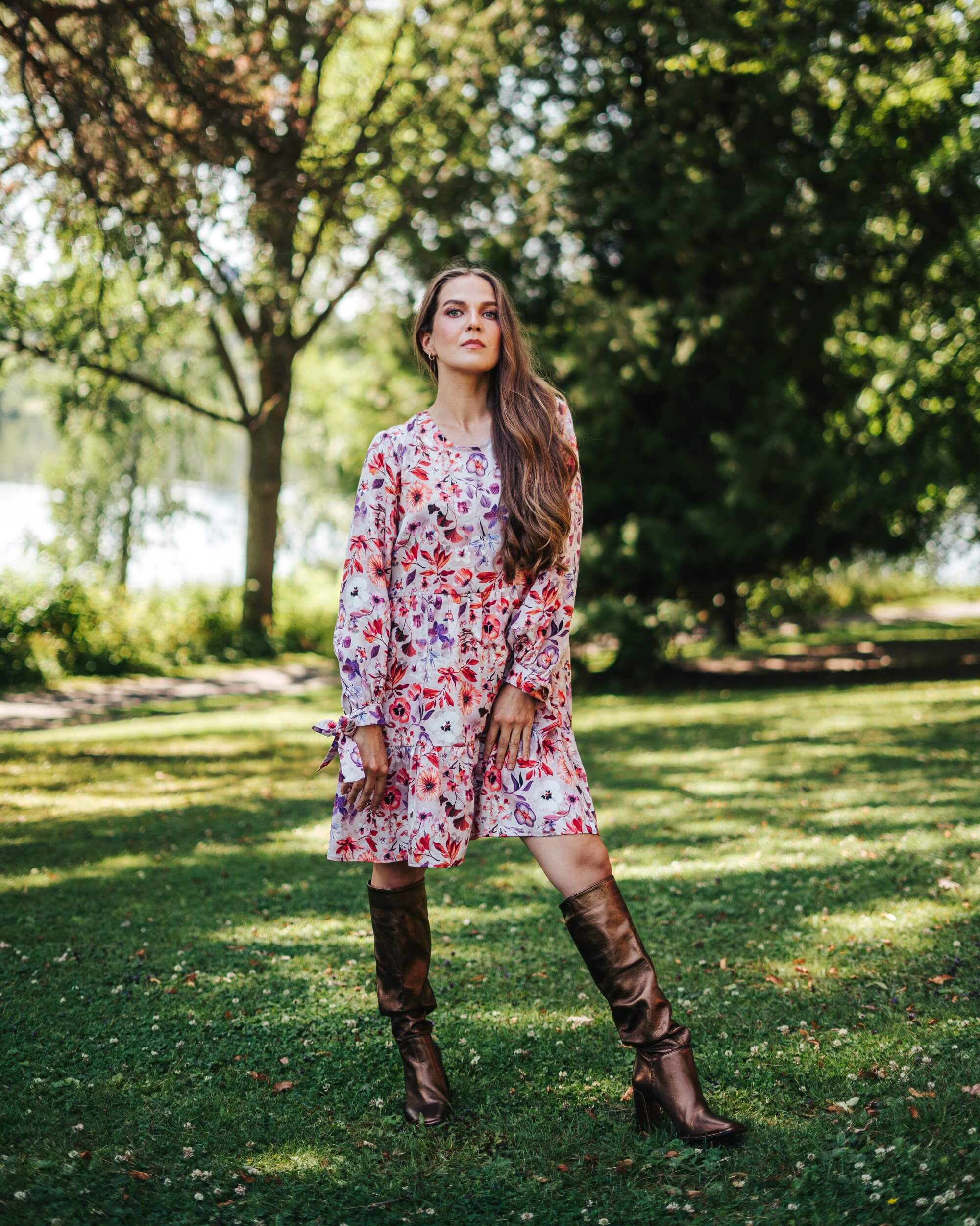 Myyntikuvista poiketen mekko kuitenkin ulottuu minulla selkeästi polven yläpuolelle.