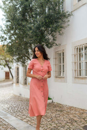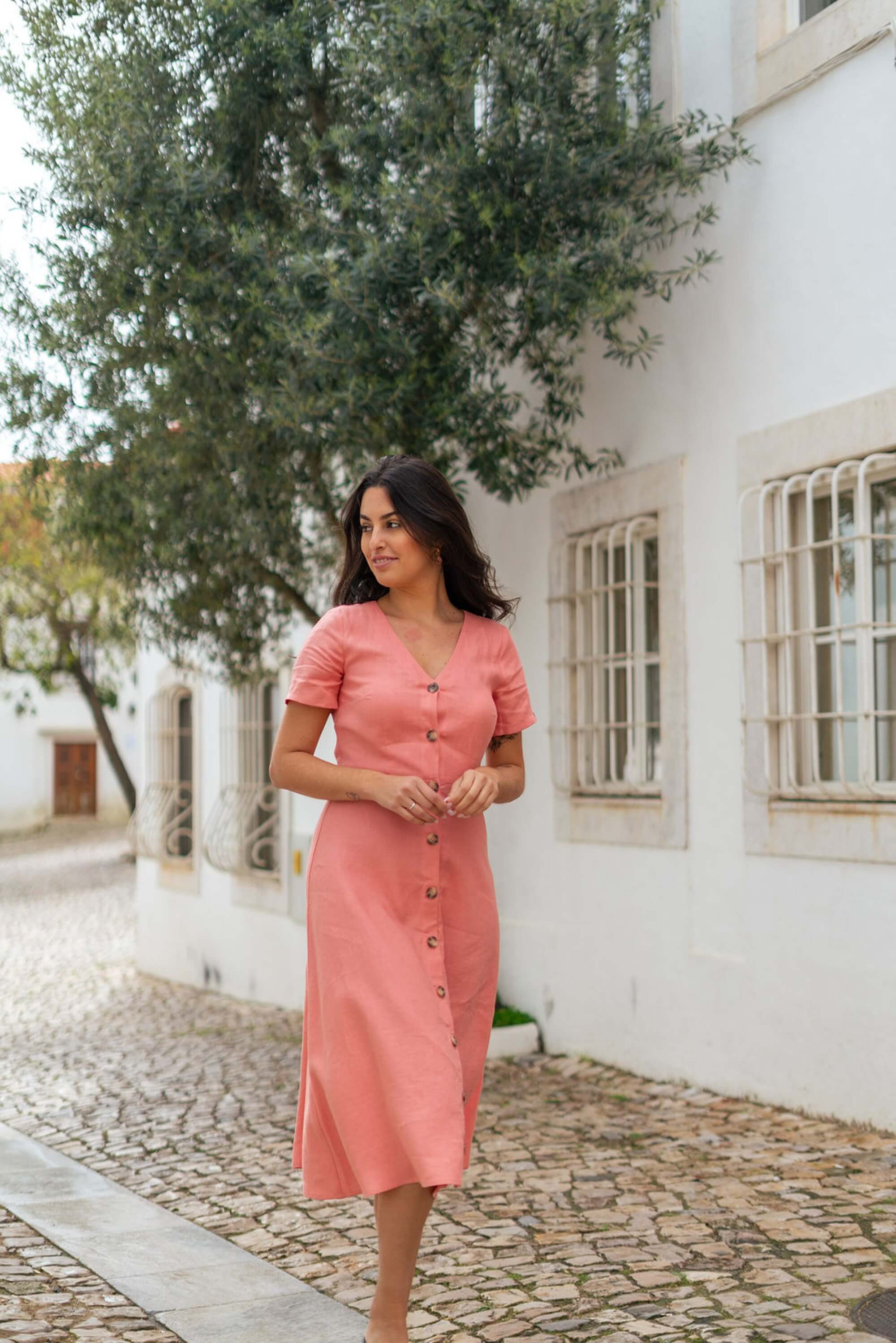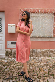 Perfect for sunny days, the Penelope Dress seamlessly combines style and comfort. This classic never goes out of style, and its elegant style is perfect for summer vacations and casual parties. The Penelope Dress is made of high-quality linen and its relaxed midi cut makes it the perfect choice for any occasion.