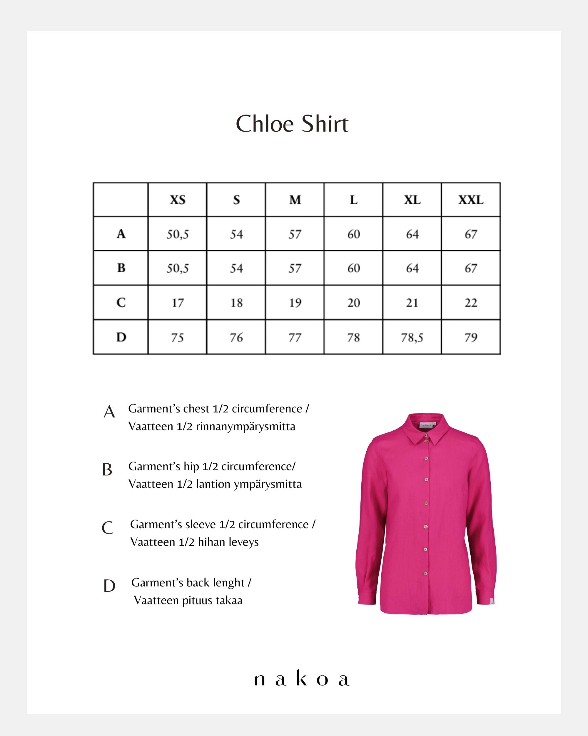 Onko mitään ihanampaa kuin täydellinen kauluspaita? Lisätessä yhtälöön vielä helppohoitoisen, ihoa vasten kevyen ja pehmeän materiaalin, on täydellinen yläosa valmis. Chloe Shirt on pellavasta valmistettu kauluspaita, joka laskeutuu kauniisti varmistaen rennon mukavuuden jokaiseen päivään. Muotolaskokset ja leikkaukset tuovat kuitenkin kaivatun ryhdikkyyden paitaan. Pellavainen kauluspaita on vaatekaapin kulmakiviä. Kauluspaidan ajaton malli ja pellavan vaivaton, kestävä materiaali tekevät paidasta pitkäikäisen ja monikäyttöisen valinnan.